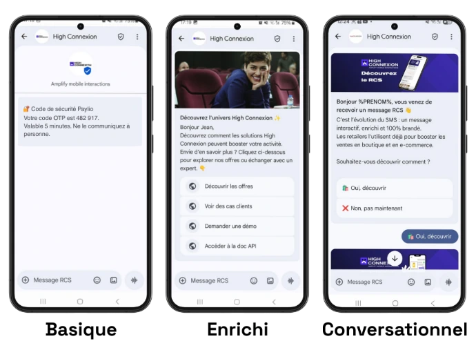 Du message simple à la conversation interactive, le RCS offre plusieurs formats pour engager vos utilisateurs efficacement.